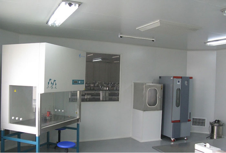 实验室主体框架为彩钢板玻璃隔断,颜色为哑白色,彩钢板每面厚度为0.426 mm,彩钢岩棉夹芯板燃烧性能为不燃性,等级为A级;隔断玻璃厚度为5 mm;为防止沉积灰尘,窗料使用R 25 mm铝合金圆弧压线;所有二维连接处的内侧均使用R 50mm铝合金内圆角,暴露在外的二维连接线的外侧则用R 100 mm铝合金外圆角连接;彩钢板的三维连接处使用三维接点过渡,而彩钢板与墙面地面则用铝合金槽铝联接。吊顶材料亦为彩钢板。微生物区室内地面为环氧树脂材料,具有无缝隙、耐腐蚀、平整、容易清洗的特性。地面地角线用阴角铝材装饰,美观且严密性好。通过科学设计、精心施工,实验室内形成坚固、无缝、平滑、美观、不反光、不积尘、不生锈、防潮、抗菌、性能优良的无菌表面和内壳,从而解决了气密性和保洁等问题。室内所有设备均嵌入墙内,使整间实验室墙面均光滑平整无缝,防止积尘,方便清洁、消毒。